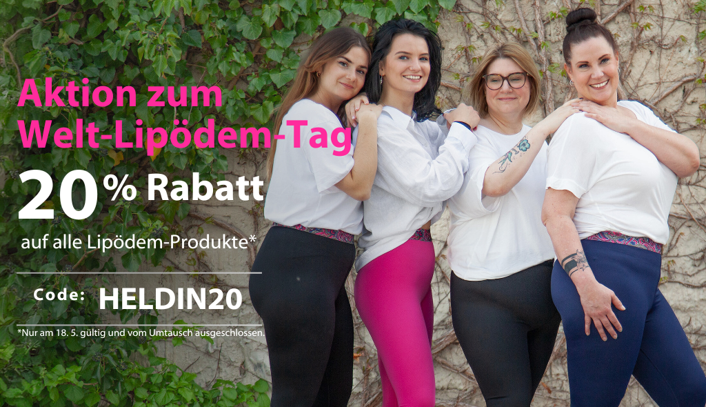 Am 18. Mai 2025 erhalten Sie – mit dem Rabattcode „Heldin20“ - 20% Rabatt auf unser gesamtes Lipödem-Sortiment. Die Aktion beginnt um 0:00 Uhr und endet um 23:59 Uhr.